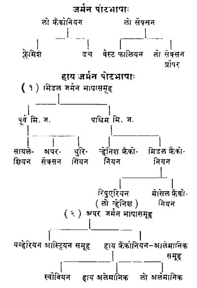 जर्मन भाषा - इंग्लीश व फ्रिजियन भाषांप्रमाणें जर्मन भाषाहि वेस्ट जर्मनिक भाषाकुलांतील आहे. याच कुलांतील लांगोबार्डिअन ही भाषा आहे. ही ९-१० व्या शतकांत लयास गेली. बर्गांडिअन भाषा ईस्ट जर्मानिक कुलांतील आहे. हिचे अवशेष ५ व्या शतकापावेतों सांपडतात, पुढें सापडत नाहींत. रोमान्स पोटभाषांनीं लांगोबर्डियन कार्डियन या भाषा लयास नेल्या. पश्चिम फ्रँक भाषहि याप्रमाणेच नष्ट झाल्या. ८४२ सालीं फ्रँक भाषाहि याप्रमाणेच नष्ट झाल्या. ८४२ सालीं फ्रँक लोक ''स्टांसबर्ग शपथांसाठीं'' रोमान्स भाषा वापरीत होते व 'लुई जर्मन', हा राजा त्यांजशीं याच रोमान्स भाषेंत बोलत होता असा दाखला आहे. 'डॉएश स्प्राश' ही पश्चिम जर्मानिक जातींची भाषा, ज्या जाती प्रथम पासून आज पावेतो जर्मानिक बोली बोलत आल्या आहेत त्यांची भाषा. या जातींत मुख्य जाती येणें प्रमाणें: सॅक्सन, फ्रँक, चट्टी, (हेशिअन), थुरीगिअन, अलेमानिअन, बव्होरिअन. लोकंट्रजिमध्यें बोलल्या जाणा-या फ्लेमिश व डच भाषा या वरील सदरांत येतात परंतु या भाषांचा उत्तरकालीन विकास जर्मनवर अवलंबून झालेला नाहीं. म्हणून त्यांचा विचार येथें नको.