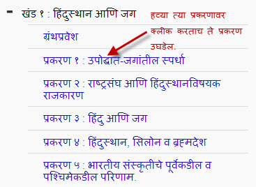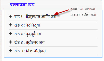 समजा तुम्हाला पहिला खंड पहायचा आहे तर त्या खंडाच्या नावावर वर दाखविल्याप्रमाणे क्लीक करा. क्लीक करताच त्या खंडातील सर्व प्रकरणांची यादी खाली दाखविल्यानुसार तुमच्यासमोर उलगडेल.