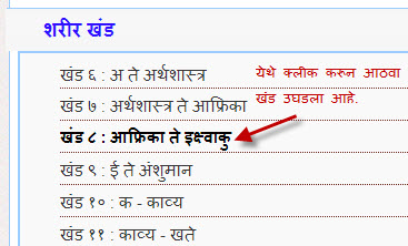 खंड क्रमांक ६ ते २१ हे शरीर खंड आहेत. यातील प्रत्येक खंडात ज्या अद्याक्षराच्या नोंदी आहेत त्याचा उल्लेख खंडाच्या नावाबरोबर असलेला दिसेल. आपण हव्या त्या खंडावर क्लीक करावे. उदाहरणार्थ खालील आकृतीत आठव्या खंडावर क्लीक केलेले दिसत आहे.