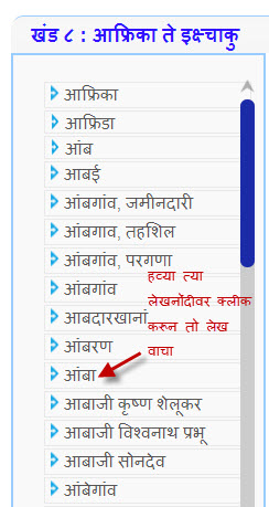 आठव्या खंडात आफ्रिका ते इक्ष्वाकु यामधील अद्याक्षरांच्या नोंदी आहेत. खंड ८ च्या शीर्षकावर वर दाखविल्याप्रमाणे क्लीक करताच तुमच्या स्क्रीनवर अगदी उजवीकडे पहा आठव्या खंडातील सर्व लेखनोंदींची यादी तुमच्या क्लीकसाठी तुमच्यासमोर हजर झाली आहे. त्या यादीच्या सुरूवातीचा काही भाग खालील आकृतीत दिसत आहे.